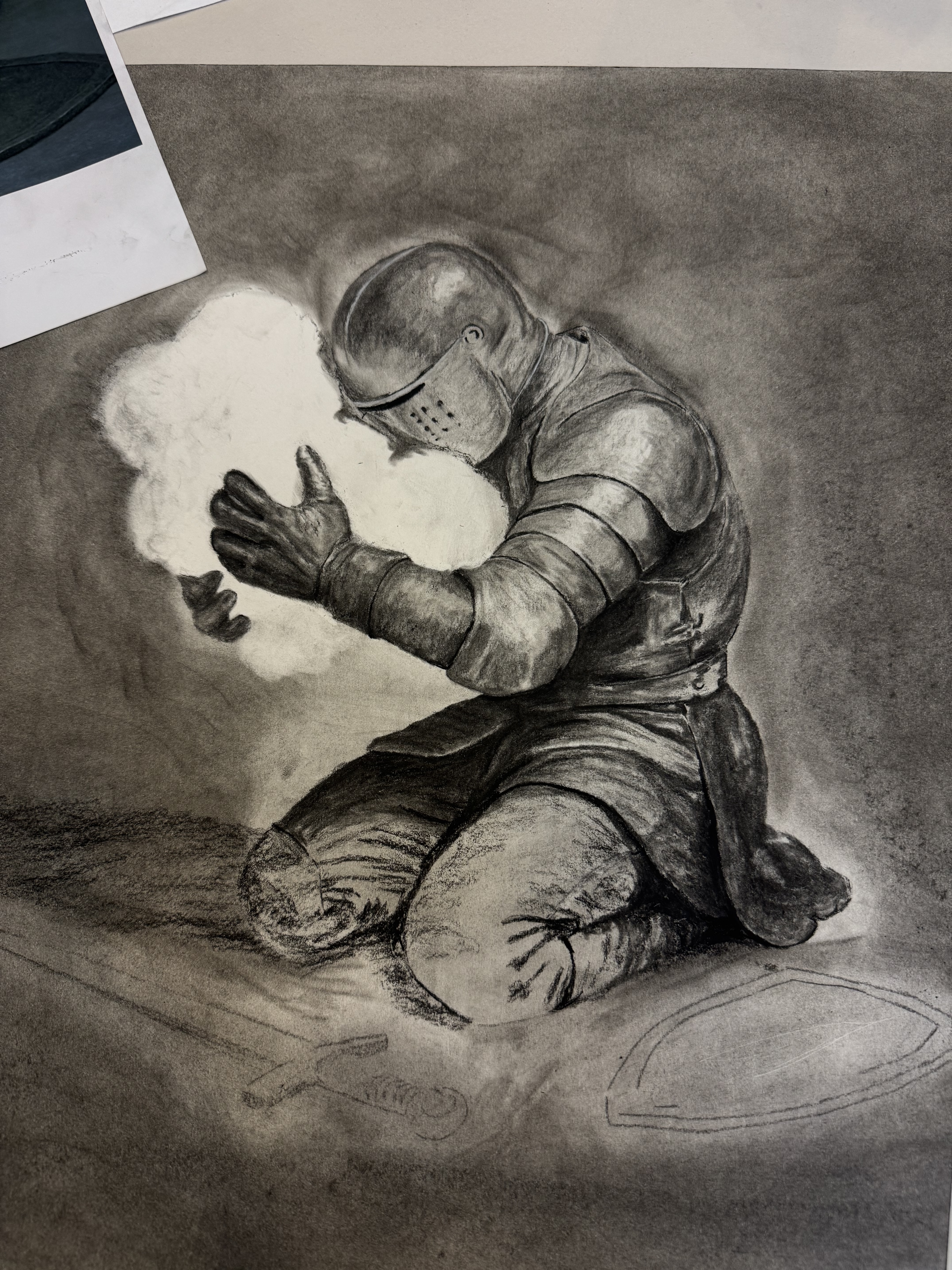 The drawing depicts a knight embracing a cloud. This type of composite imagery brings together two distinct subjects—an armored figure and an atmospheric form—into a single scene.