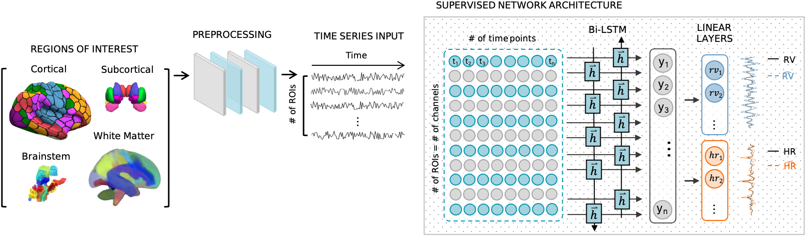 DeepPhysioRecon uses a bidirectional Long Short-Term Memory (LSTM) network to jointly predict respiration variation and heart rate from fMRI time-series data. The key insight is that RV and HR are coupled, so learning them together improves accuracy for both.