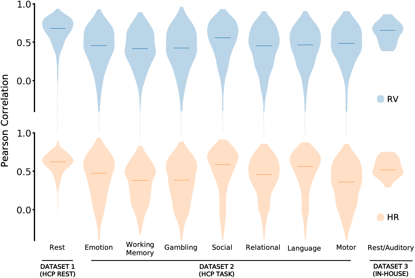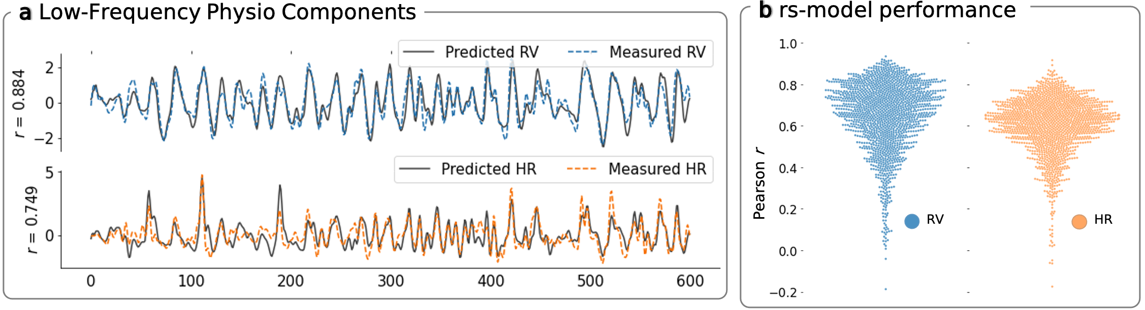 Models trained on resting-state fMRI data from the Human Connectome Project achieved median correlations of approximately 0.68 for RV and 0.63 for HR against measured physiological signals. The models generalized across experimental conditions, different subjects, and even different scanners and acquisition parameters.