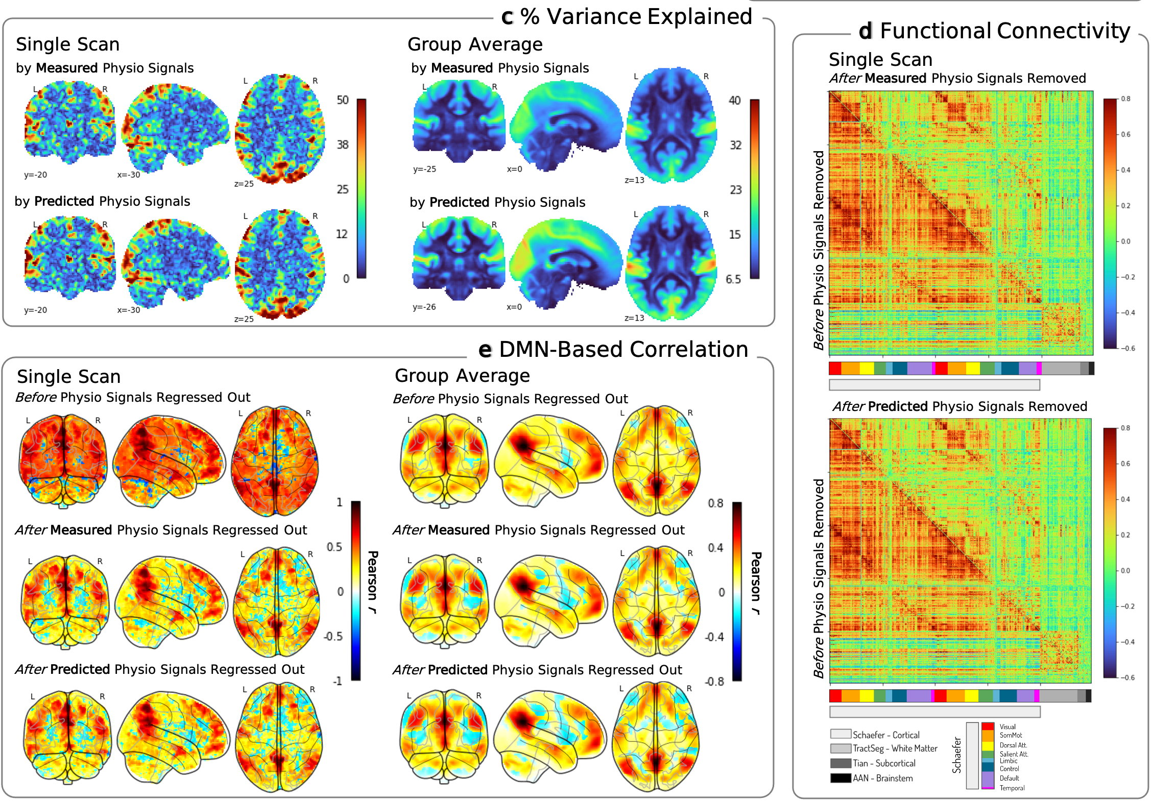 The predicted signals can be used to account for physiological effects in fMRI analyses. We showed that removing predicted RV and HR from fMRI data alters functional connectivity maps in ways that closely match what happens when using measured physiological signals.